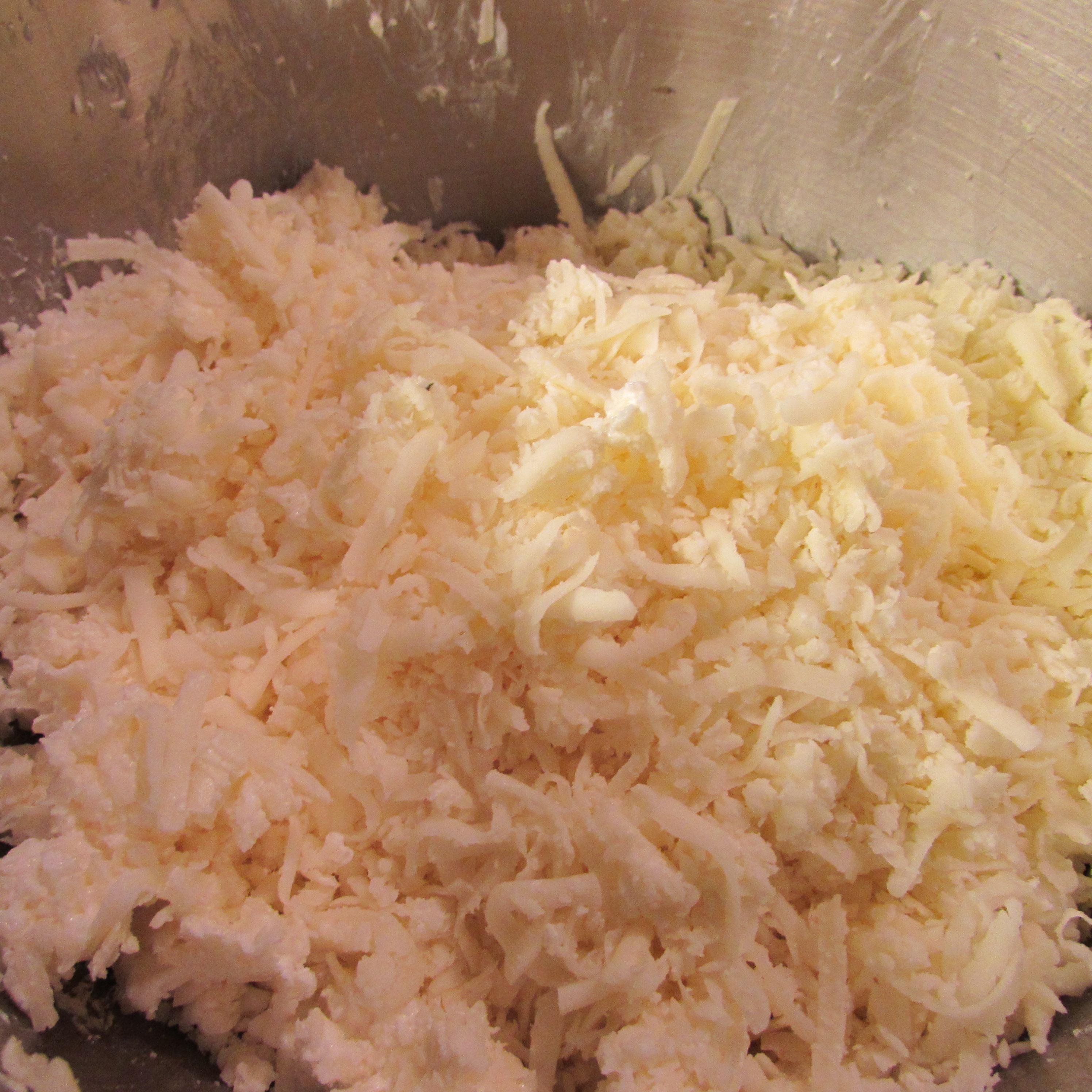 In a large bowl, combine together mozzarella, Parmesan and Romano cheeses.