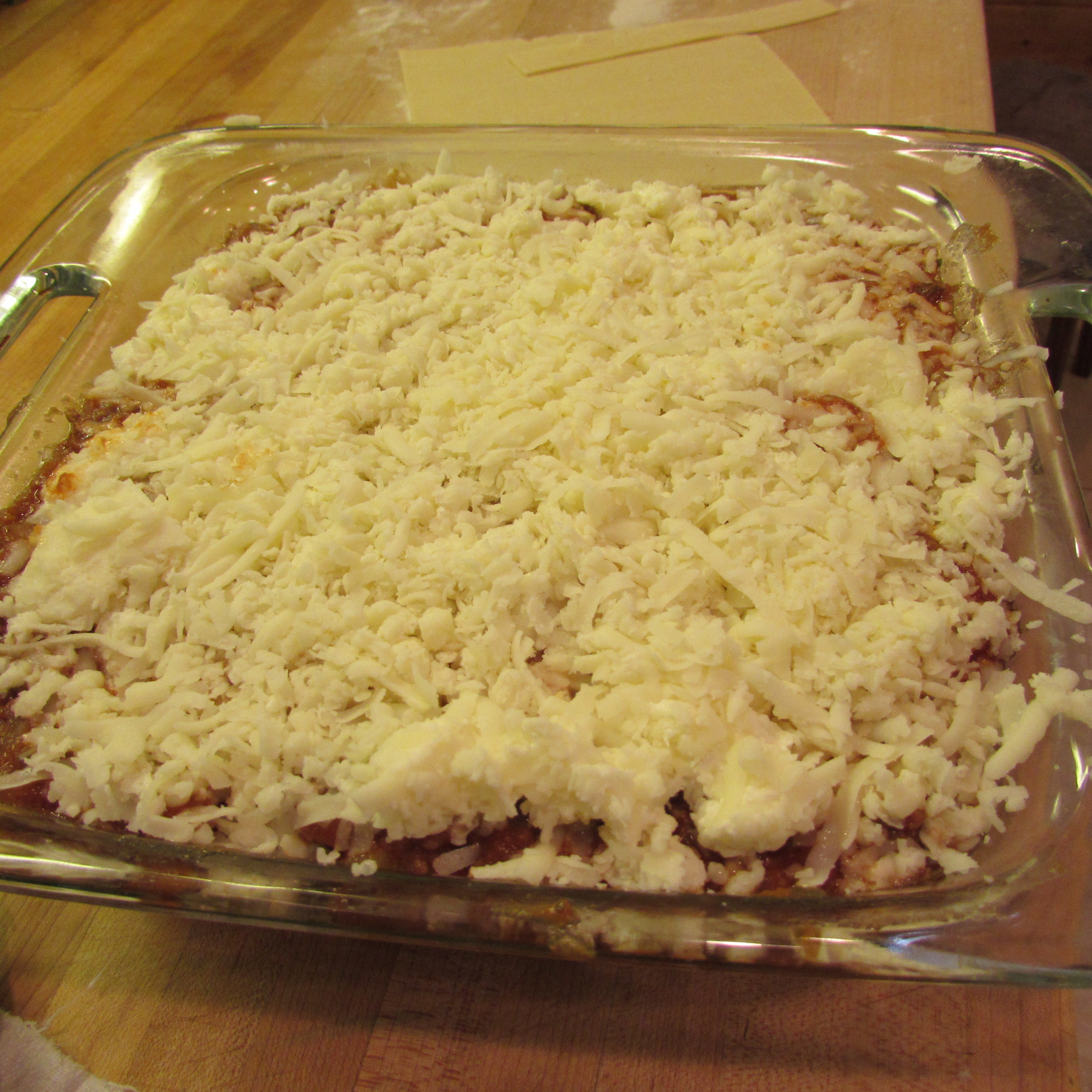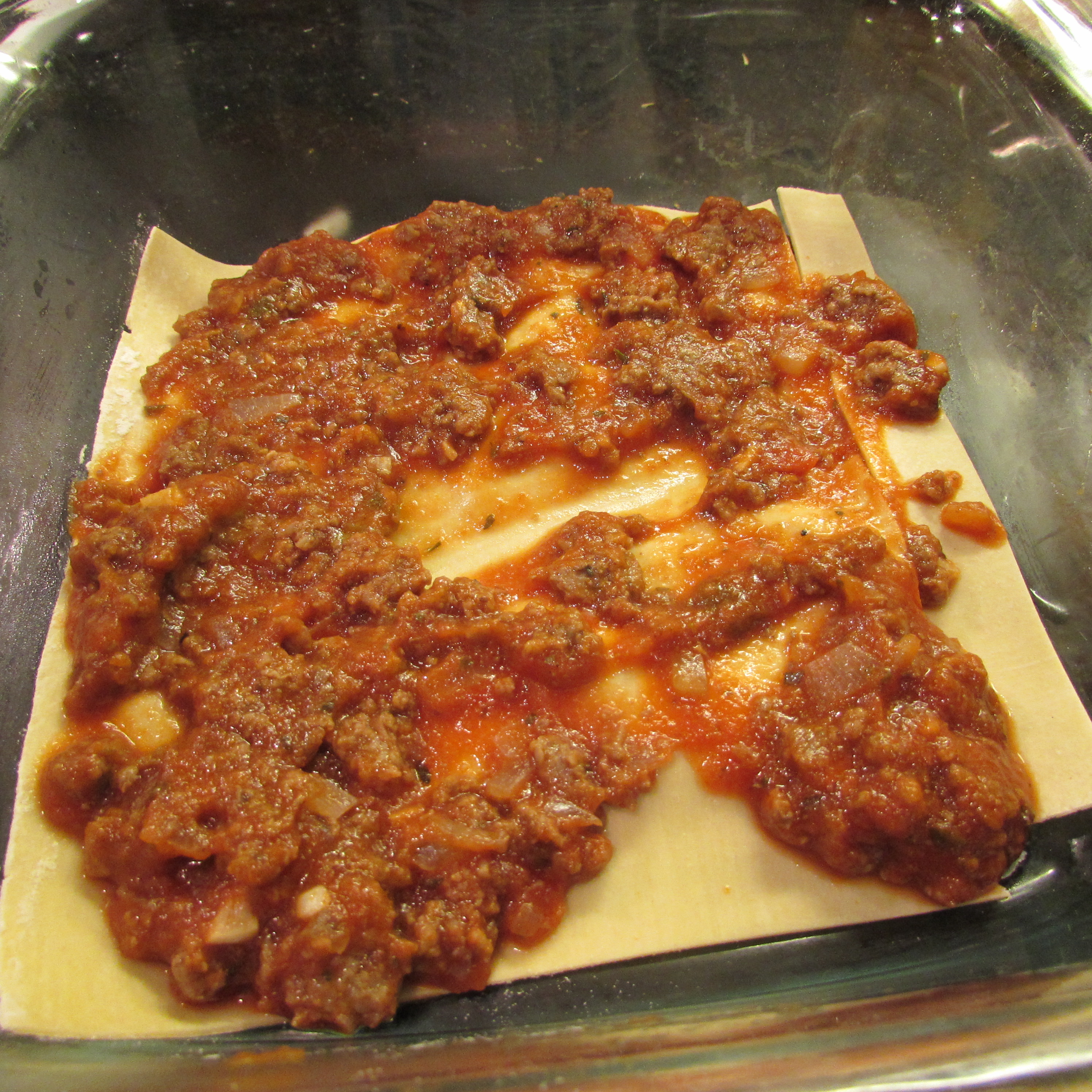 In a 9×9 pan, begin layering with sauce, noodles, sauce, cheese and repeat until the pan is as full as it can be without the cheese running over the sides.