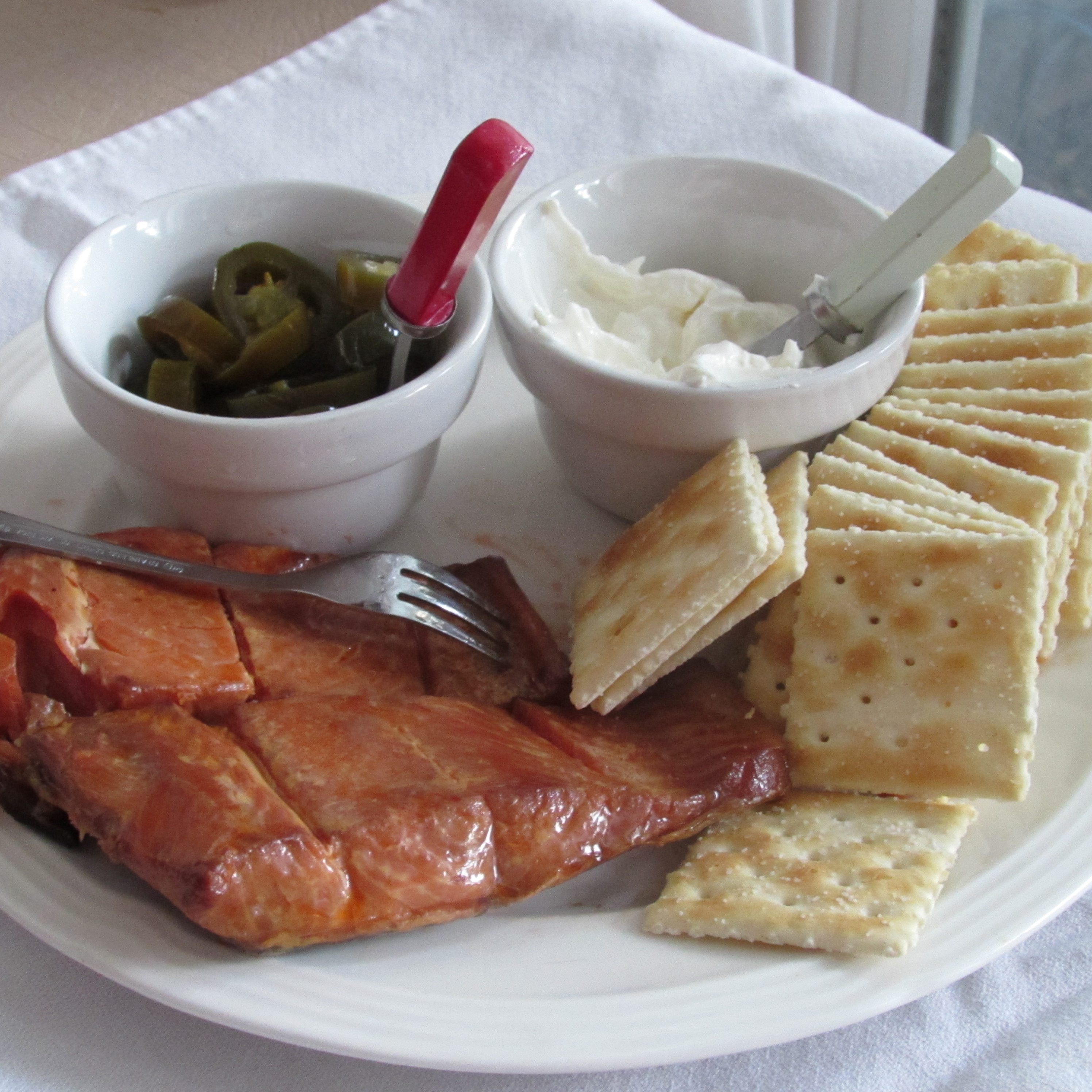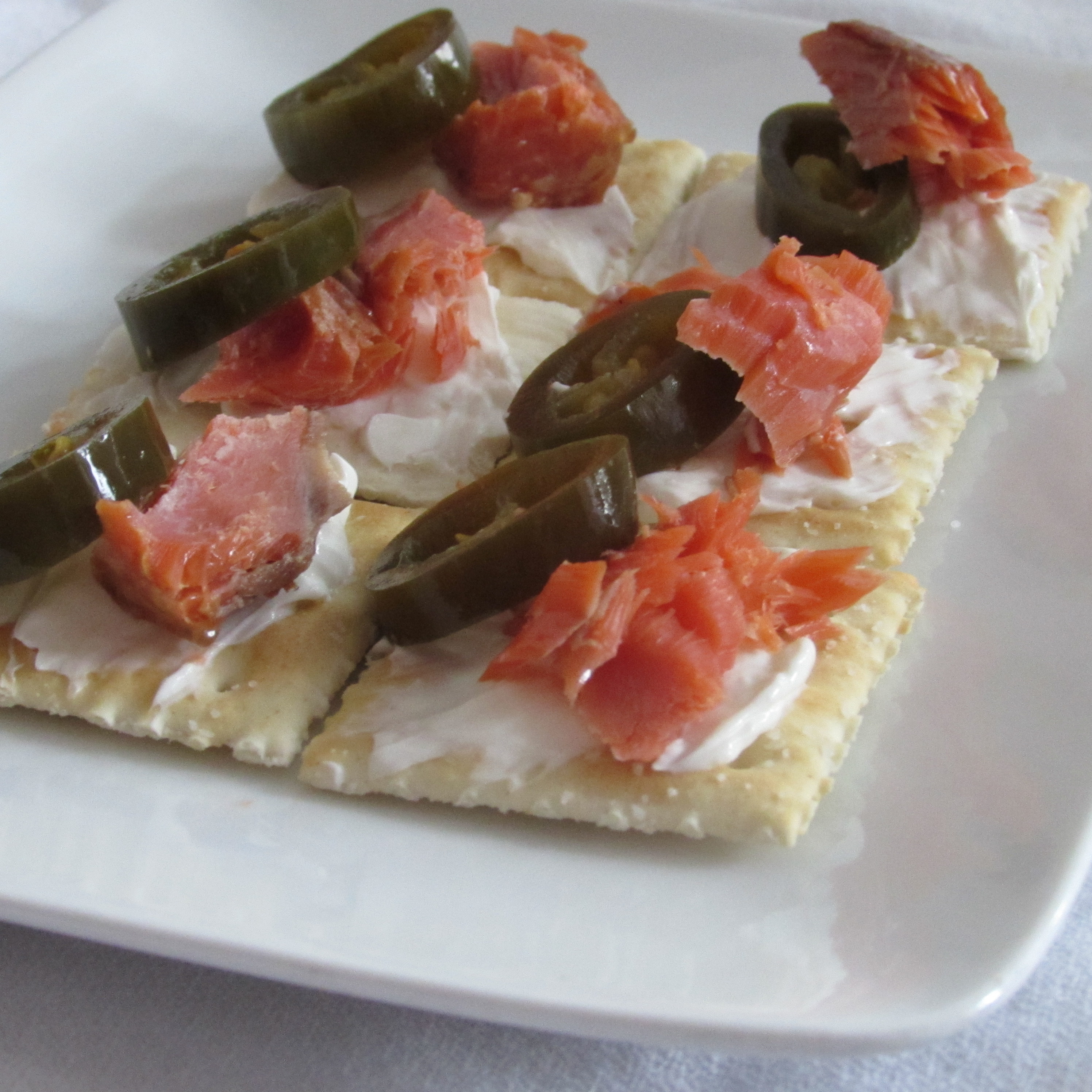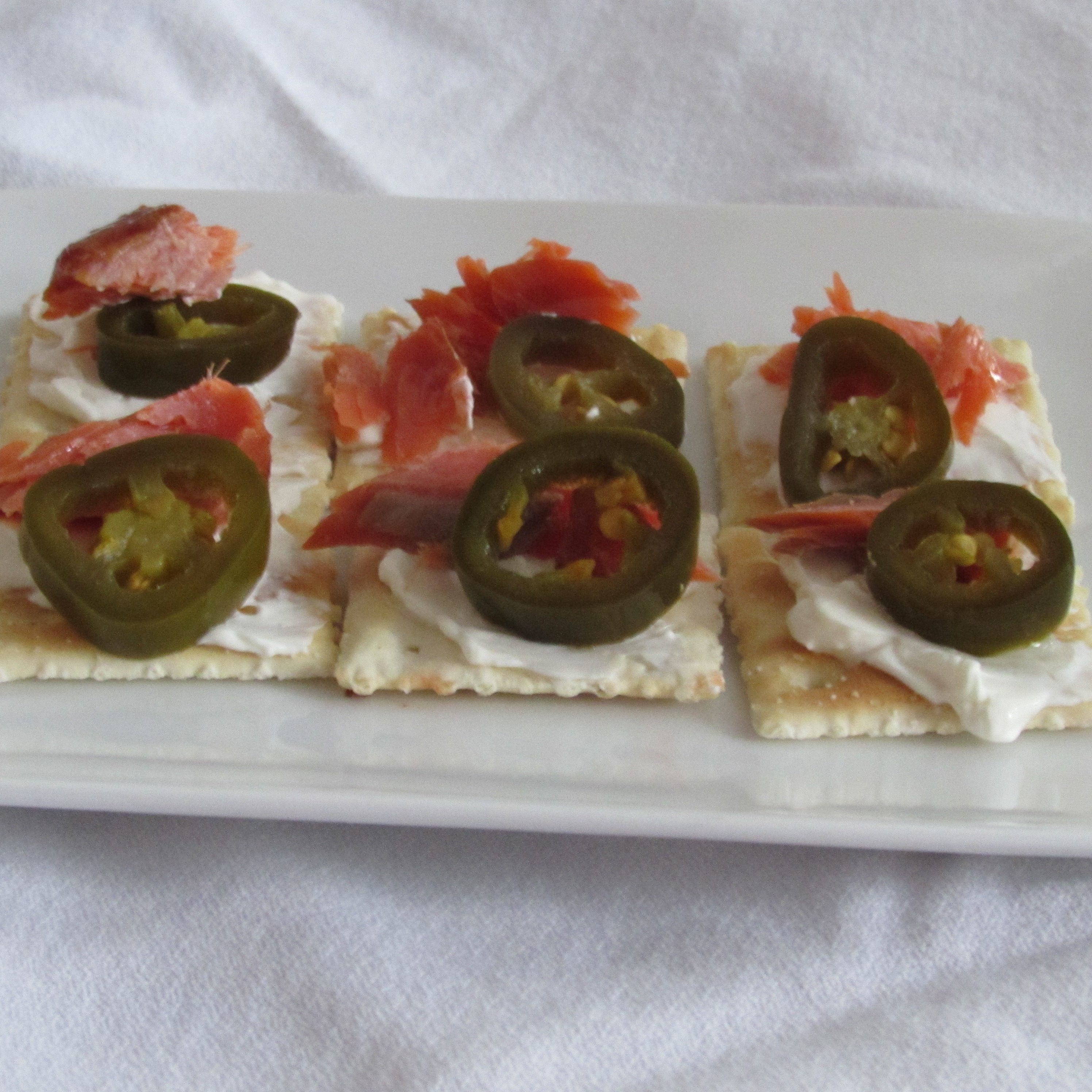 Spread crackers with cream cheese, top with a bit of smoked salmon and a jalapeno ring.  Sit back and watch as it gets devoured in less time than it took to throw together.  Thanks, Anthony!