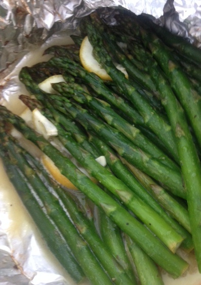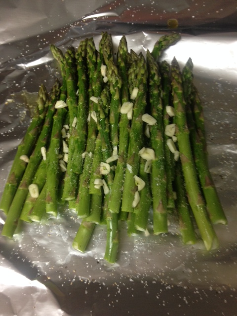Place a piece of foil flat. Place your freshly trimmed asparagus on top.