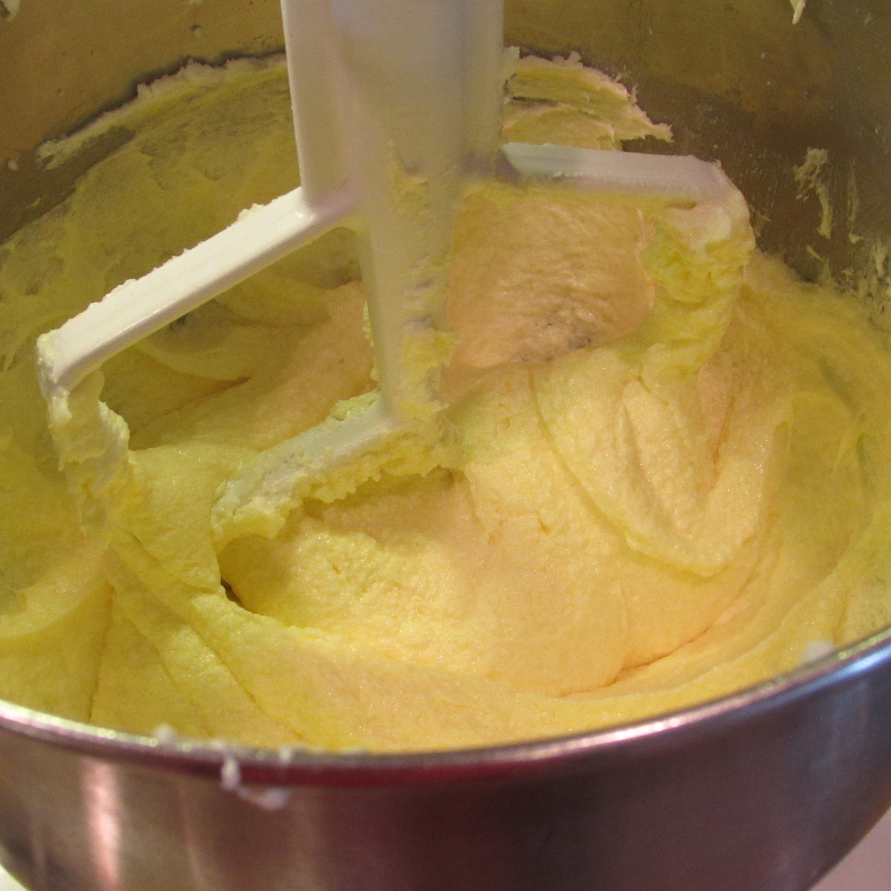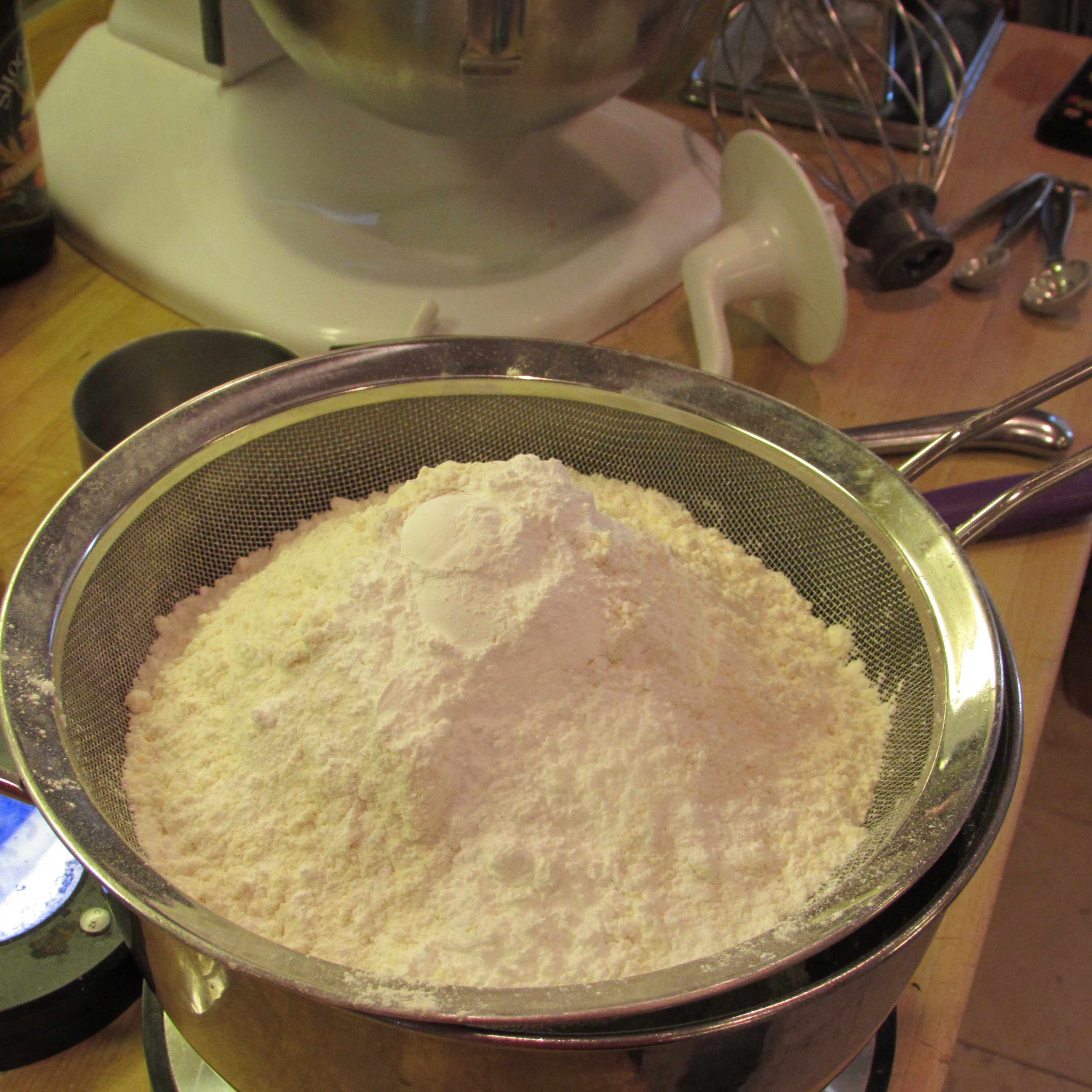 In a separate bowl, sift together flour and baking powder. Add dry mixture into wet mixture in three separate parts, mixing in thoroughly and scraping down bowl after each addition. Once mixture is smooth, mix for one more minute.