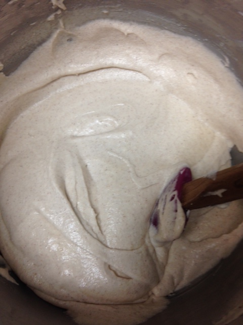 Cream butter and sugar with a hand or stand mixer until light and fluffy. Mix in egg whites, one at a time. Mix in sour cream, milk and vanilla – one ingredient at time.