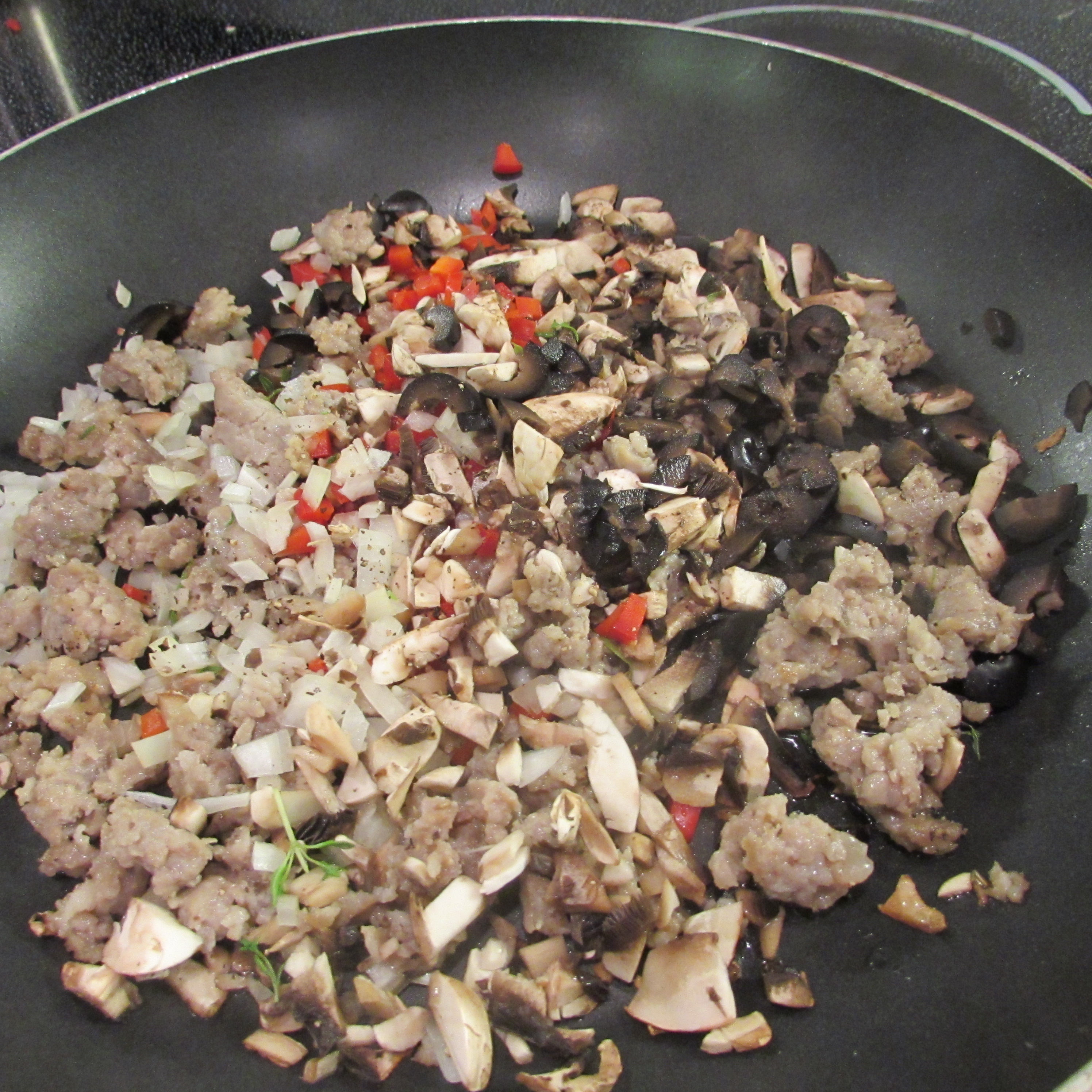 In a large skillet on medium heat, cook Italian sausage until browned (or heated, if already cooked), add in bell pepper, mushroom, black olives, onion and thyme leaves.  Cook for around 5 minutes or until vegetables are tender-crisp.