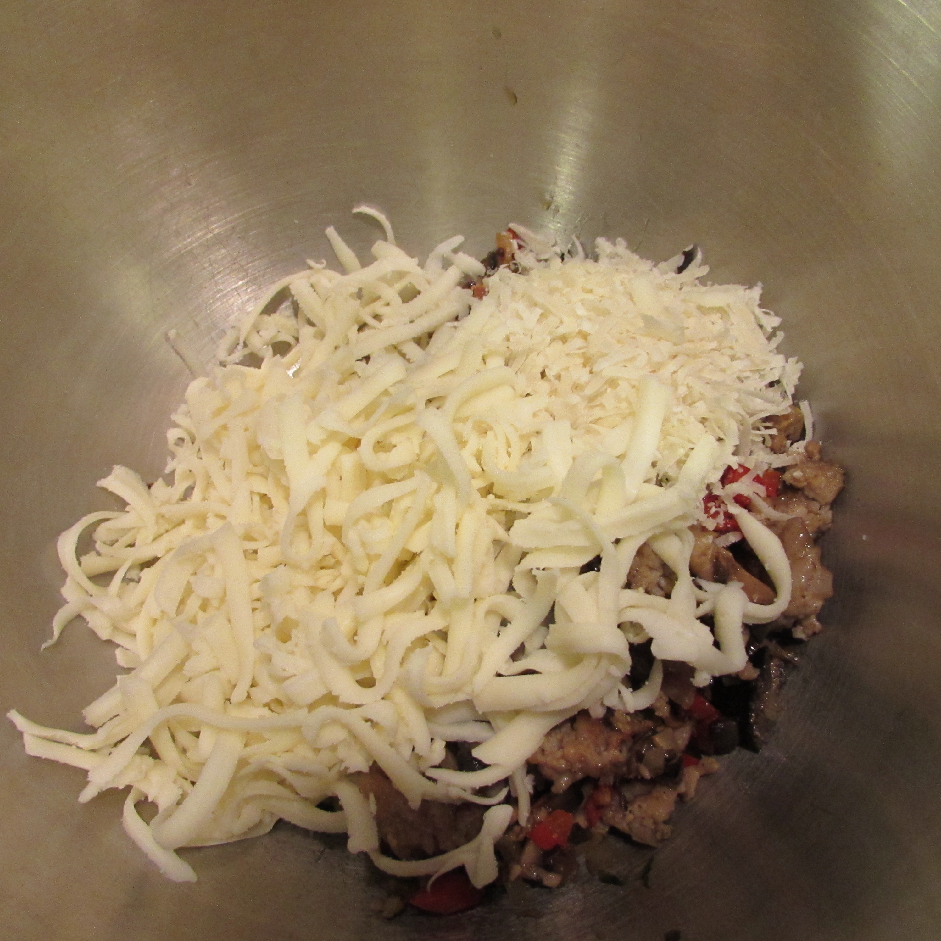 Remove from heat.  Mix meat and vegetables with parmesan and mozzarella cheese until mixture begins to stick together (around 3 minutes).