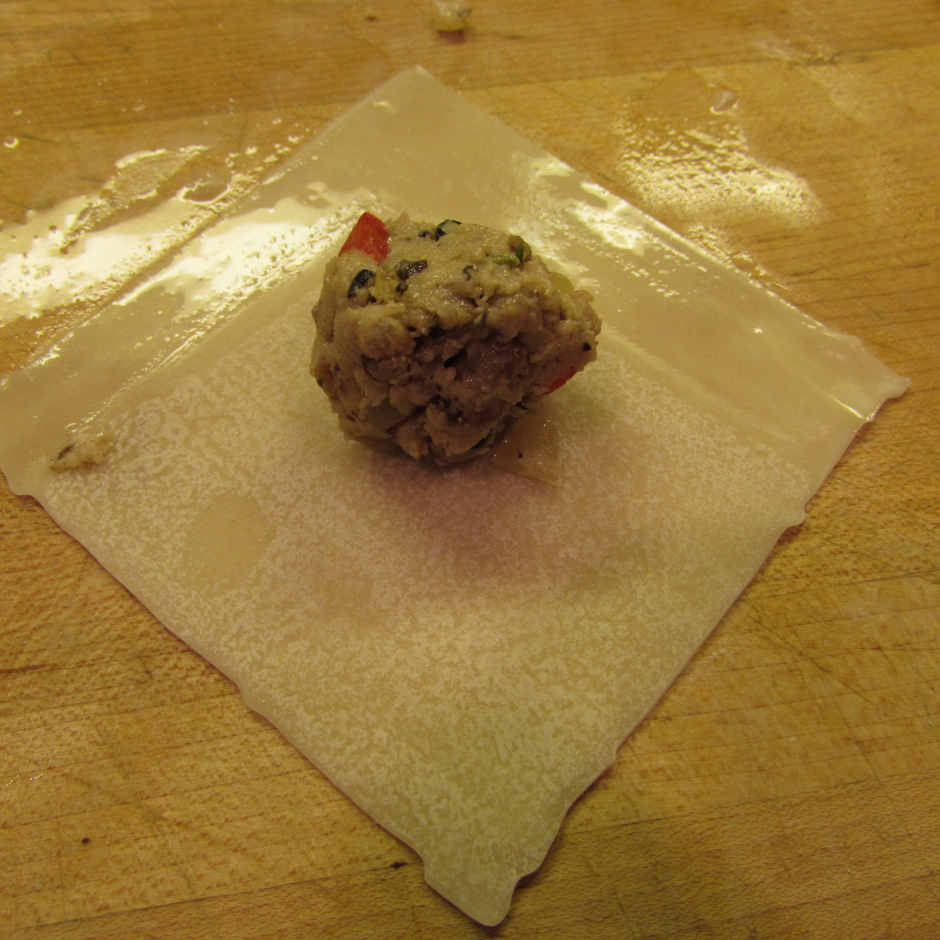 Drop mixture by heaping teaspoon onto wrapper.  Brush edges with water and press to seal.  Repeat.