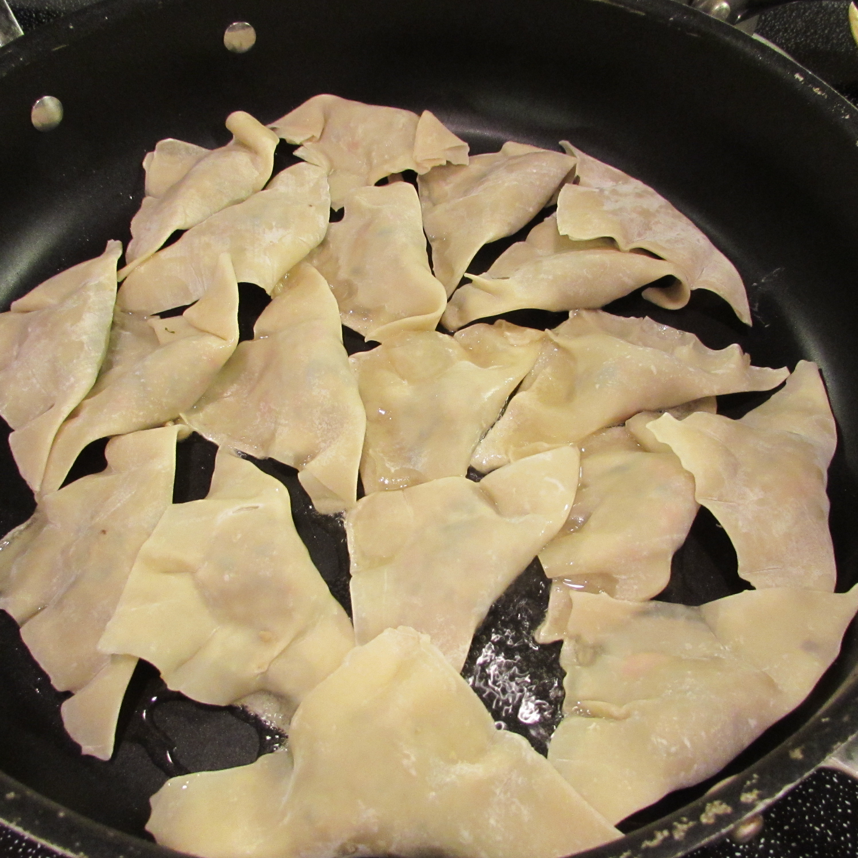 Preheat large skillet to medium heat.  Drizzle oil in pan and put in several dumplings.  Cook for around 1 ½ minutes, flip and cook for another 1 ½ minutes.  Skins should look blistered and slightly browned.  Pour ½ cup water in the pan and cover to steam around 3 minutes.  Remove lid and allow to continue cooking until most of the liquid is evaporated.