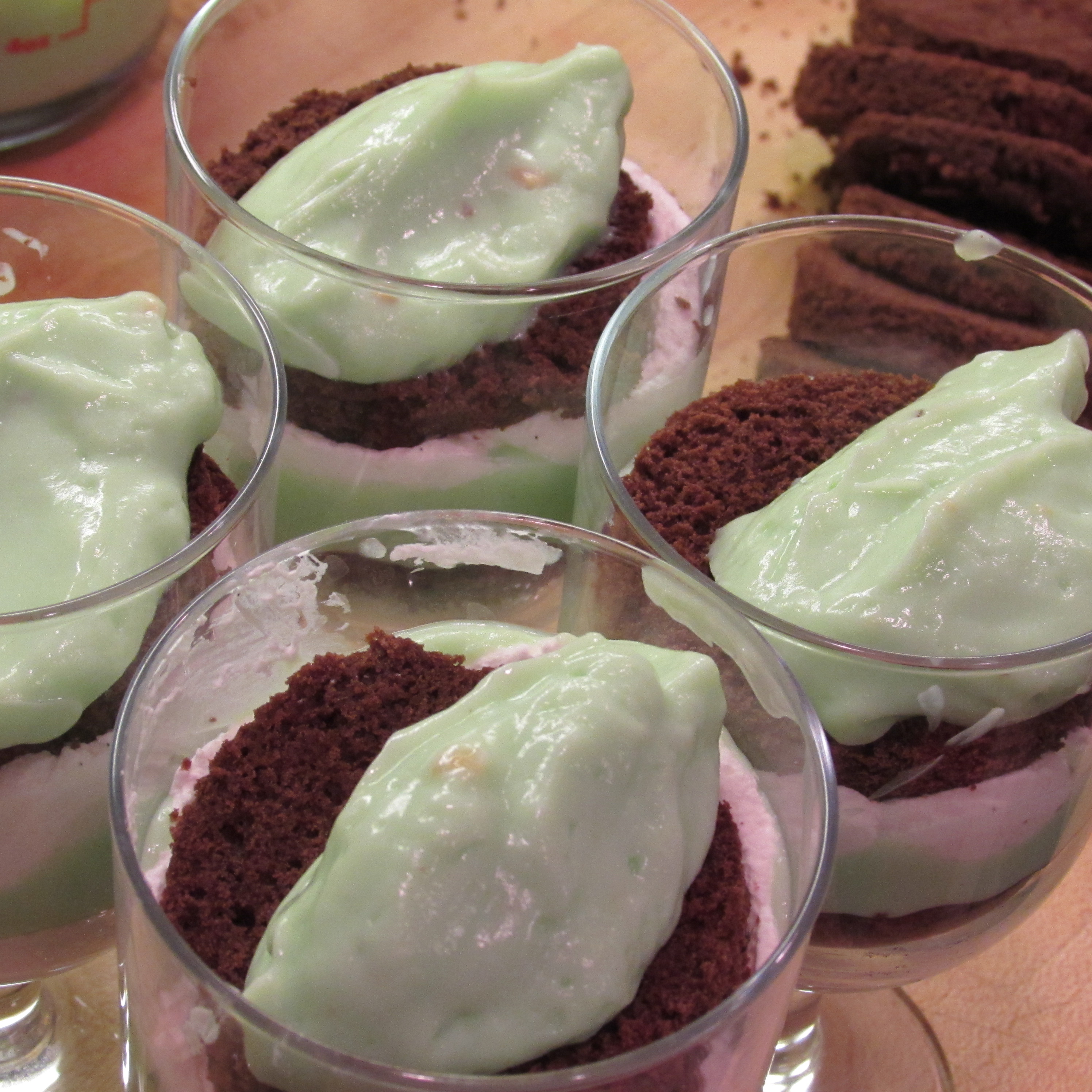 Next, I searched my stack of pudding packets and assessed my whipping cream situation.  Sweet!  Pistachio – my favorite!  So I whipped up some pudding and cream, grabbed my ring mold and started cutting layers.
