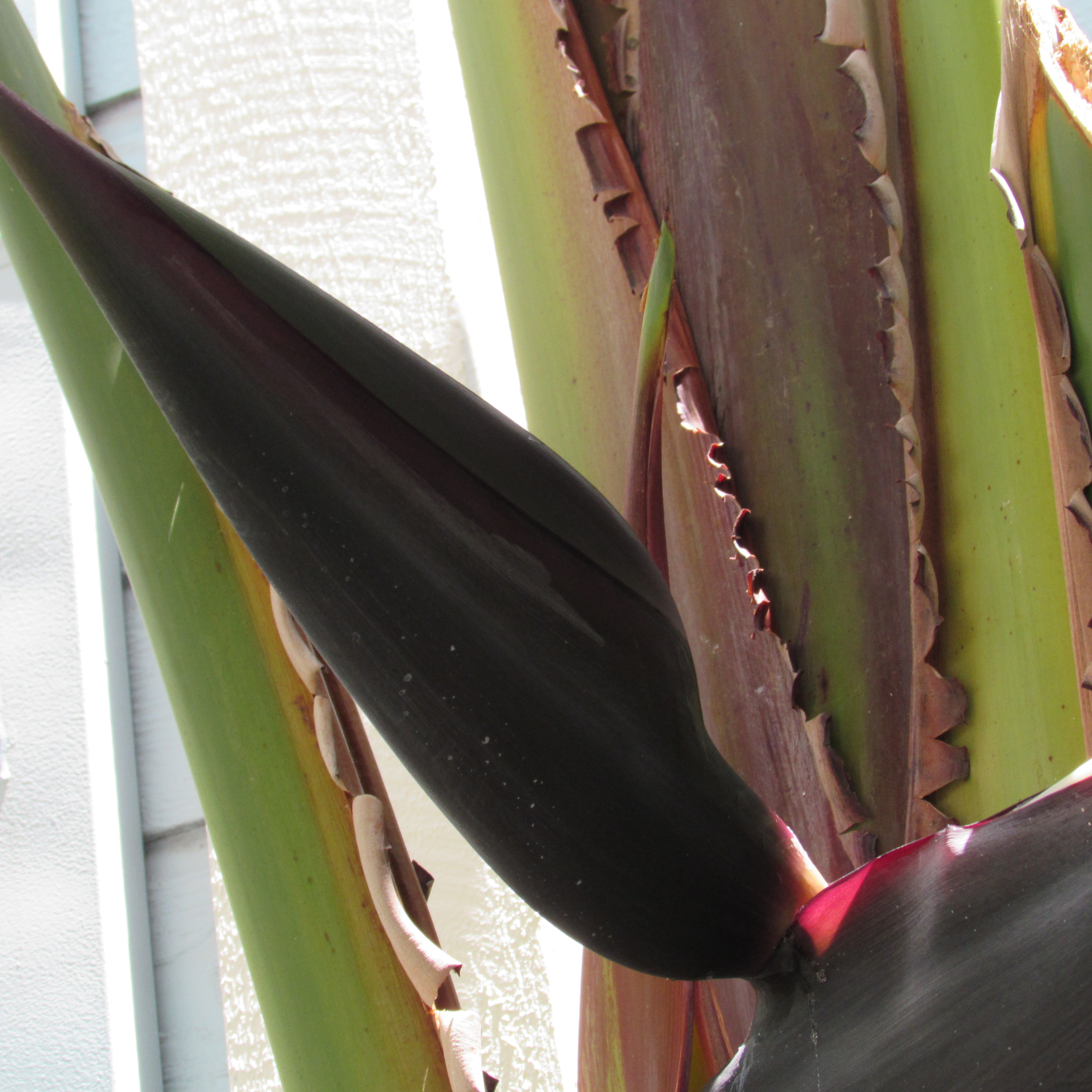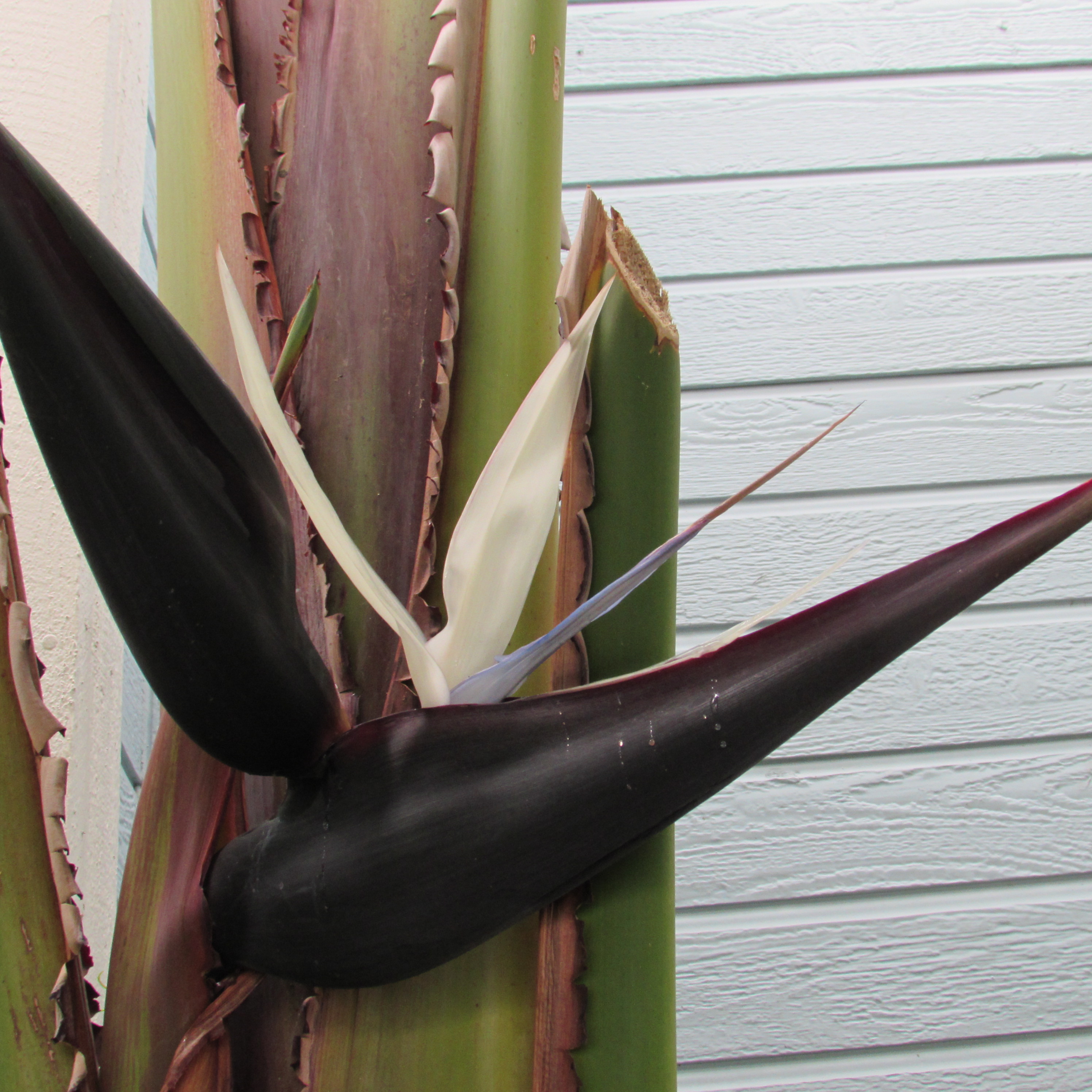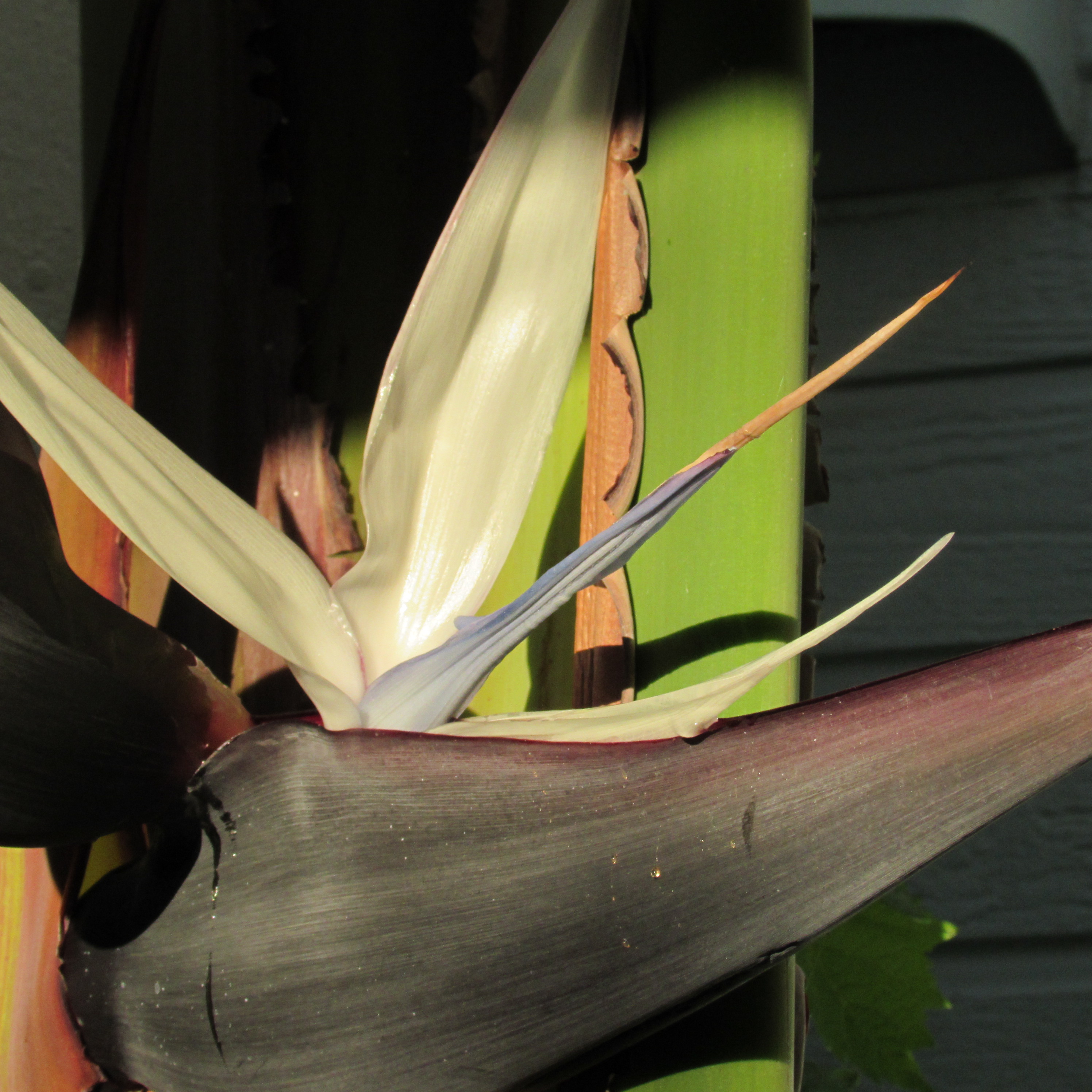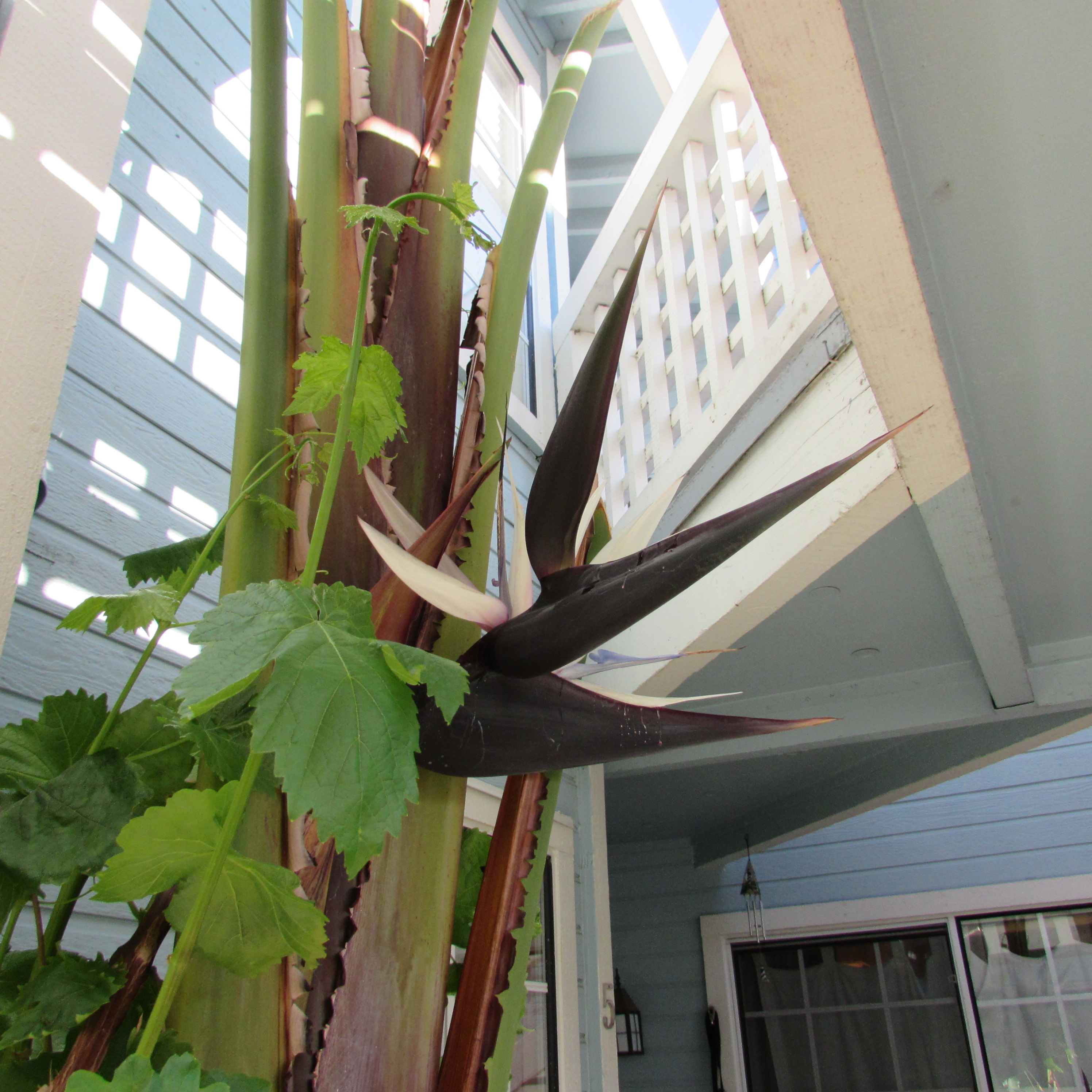 I just had to share – this white bird of paradise gigantis was gifted to me from our dear friend Victoria at The Halau nearly a decade ago.  For a while it was a very manageable sized plant that lived out front in a pot.  Then, deciding it needed more room to grow, I put it in the ground.  It grew by leaps and bounds and even became a great stabilizing plant for my grape vine (maybe that’ll produce grapes someday).  But after many years in the ground, and its height reaching nearly two stories now, I just wasn’t sure if it would ever bloom.  Recently, due to HOA landscaping guidelines, I needed to give it a good trimming back, which included removal of a lot of the little baby plants around the shallow root system.  I knew the plant was in a little shock but was doing just fine.