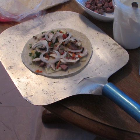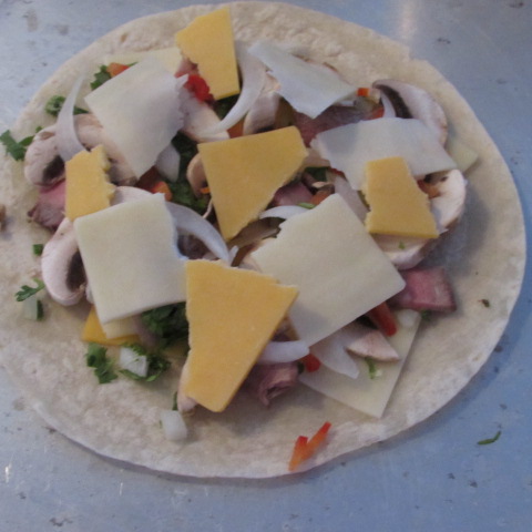 Light coals in BBQ. Place griddle or pizza stone on grill. Once coals begin to grey, put lid on BBQ and reduce heat. On a pizza peel, lay down a tortilla, top with slices of cheese, diced onion, diced cilantro, steak, mushroom, bell pepper and sliced onions. Top with a few more cheese slices.