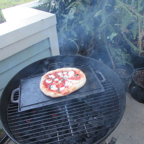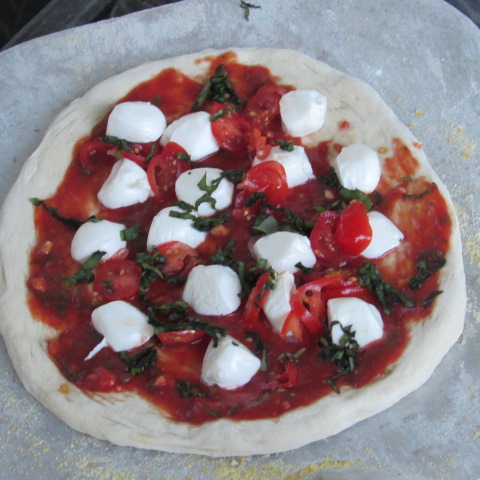 With summer laying on the heat, sometimes dinner preparation gets chased outdoors, where the heat can escape without cranking up the air conditioning. And pizza is one dish that requires a lot of heat! So tonight it’s pizza on the grill. I’m using my Neapolitan style crust, which holds up to heat well, makes a nice crisp crust and is still thin enough to ensure even cooking of the toppings.