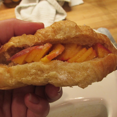 Slice croissant in half, leaving one edge in tact. Place peach slices in croissant, sprinkle with sugar and cinnamon. Place in waffle iron and cook for around 2 minutes or until golden.