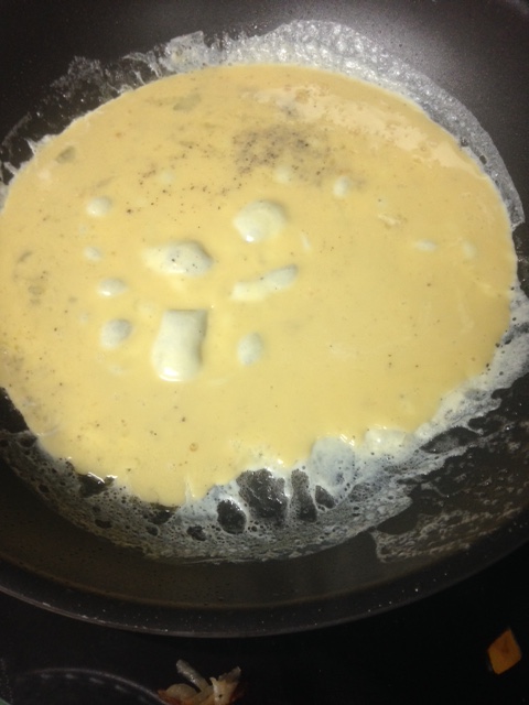 Whip eggs and milk in a small bowl, add a pinch of salt and pepper.