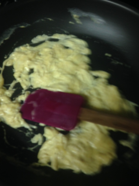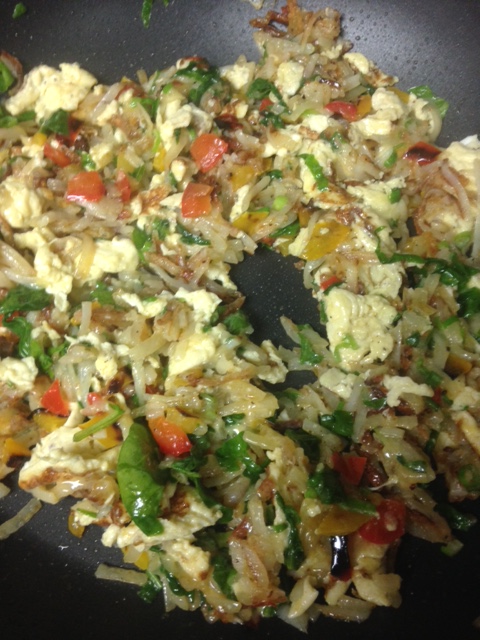 Add hashbrowns (see note above about hashbrowns) and spread evenly in the pan. Allow to cook 4-5 minutes. Stir the hashbrowns around the pan to get a nice even crisping on all of the potatoes, rather than flipping them in sections. Cook another 3-4 minutes, stirring every minute or so. Remove the hashbrown mixture and set aside.