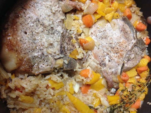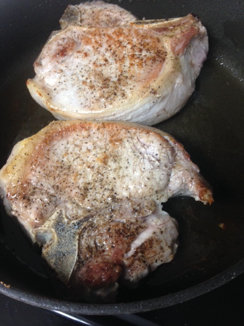 Sprinkle each side of your pork chops liberally with salt and pepper. Place into pre-heated dutch oven or oven safe pan with a tight fitting lid, over medium-high heat in a tablespoon of oil, and sear each side until brown. Remove from pan and set aside.