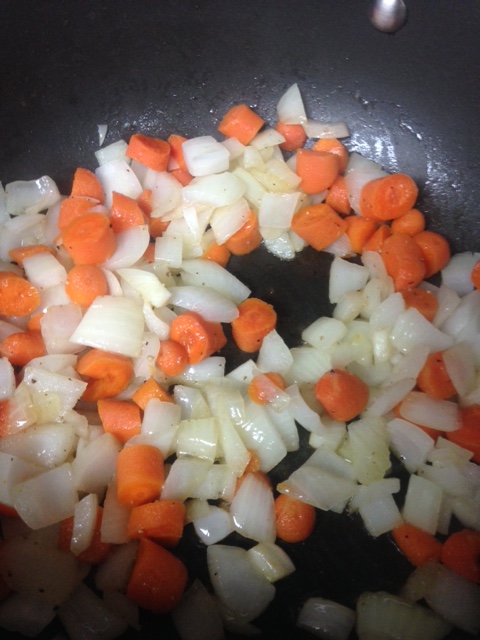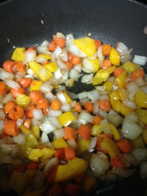 In the same pan, add 2 tablespoons oil, then add carrots and onions. Sprinkle lightly with salt and pepper. Cook 3-4 minutes, stirring occasionally. Add bell pepper, cook another 2 minutes.