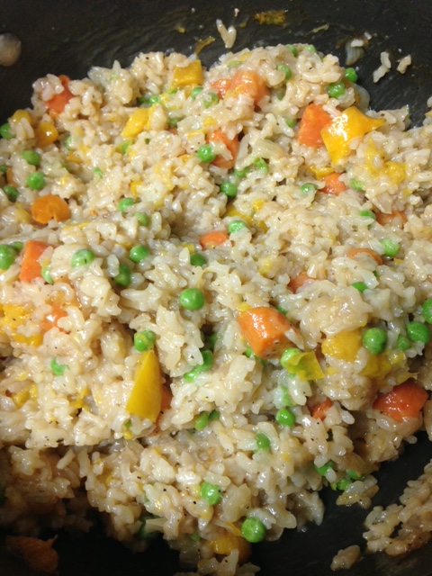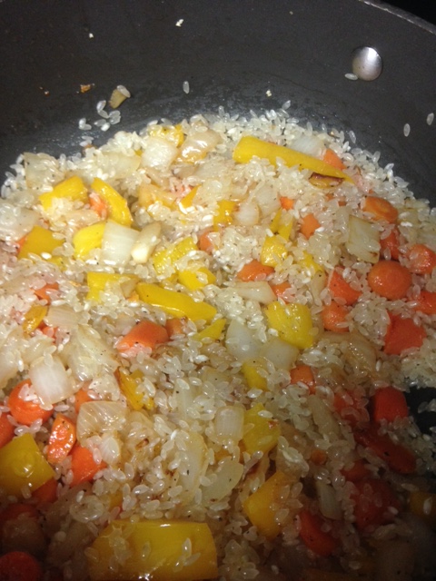 Add rice and garlic. Allow rice to brown slightly, stirring occasionally, for about 3-4 minutes.