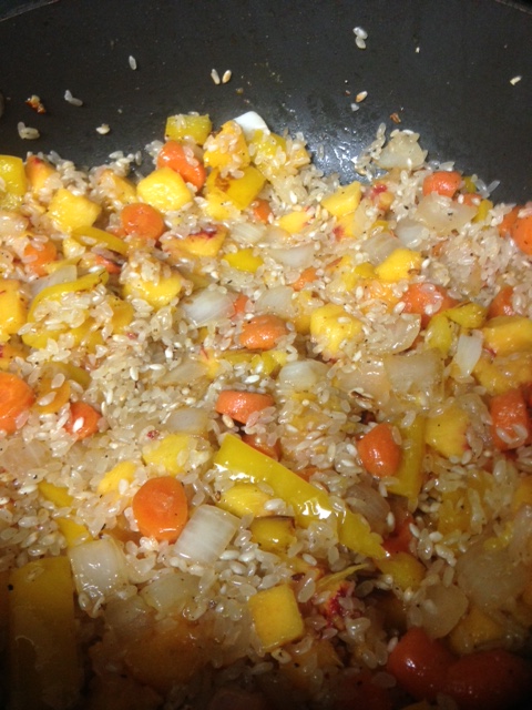Peaches are in season! Lucky me, not only did I get some great O’Henry peaches from Mana’s Ranch, I happened to get some 30% bargain bin thick cut pork chops when I hit the Safeway yesterday. I think this dish would work equally as well with chicken.