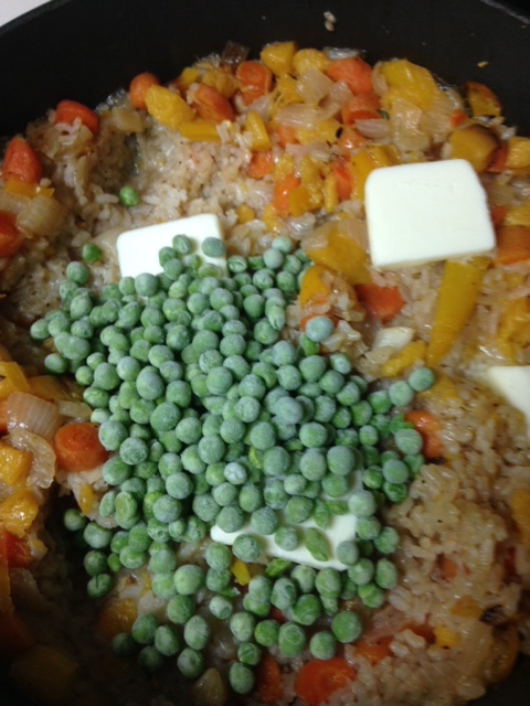Remove pork chops. Add butter and peas. Mix. The heat from the rice will melt the butter and defrost the peas.