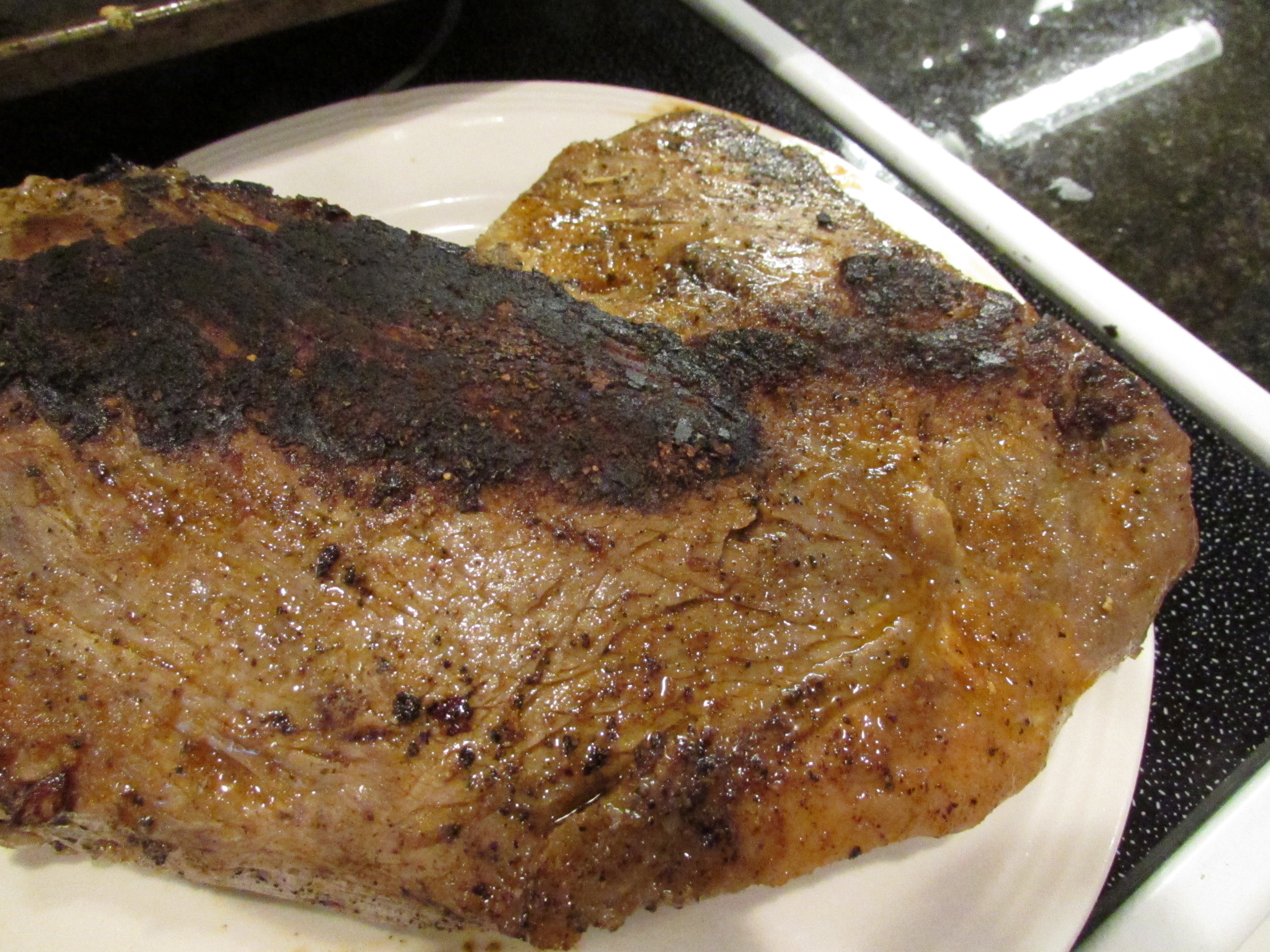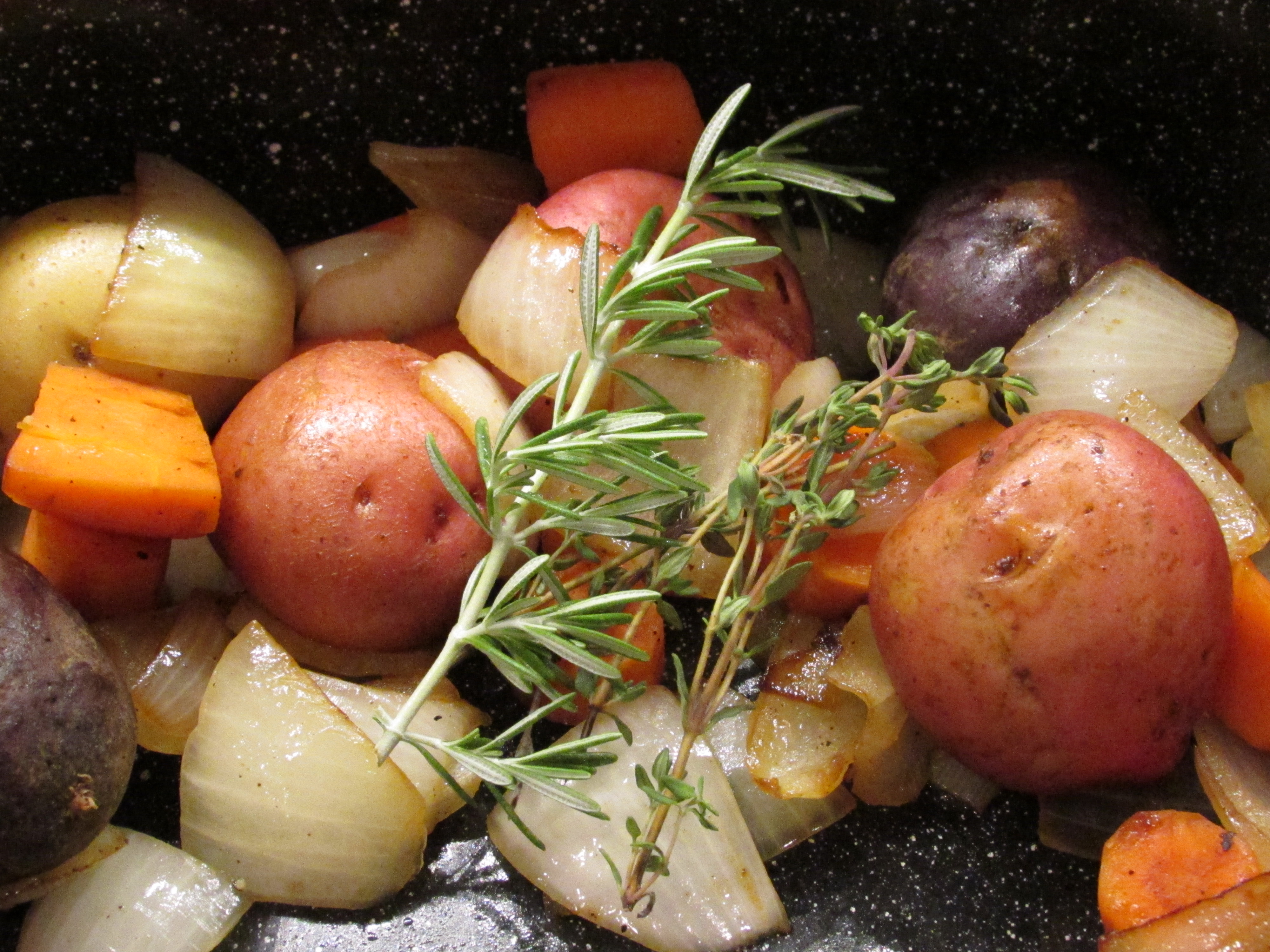 Quickly put drained vegetable in hot pan and let cook for around 6-8 minutes or until vegetables start to blister/brown on edges. Remove from heat. Place vegetables in a roasting pan, top with rosemary and thyme and place seared meat on top. Cover with lid or aluminum foil and cook 35-45 minutes or until vegetables are tender and meat is cooked to desired doneness. This roast was a little too done for me (I like mine still mooing), but the flavor was great and the meat was tender.