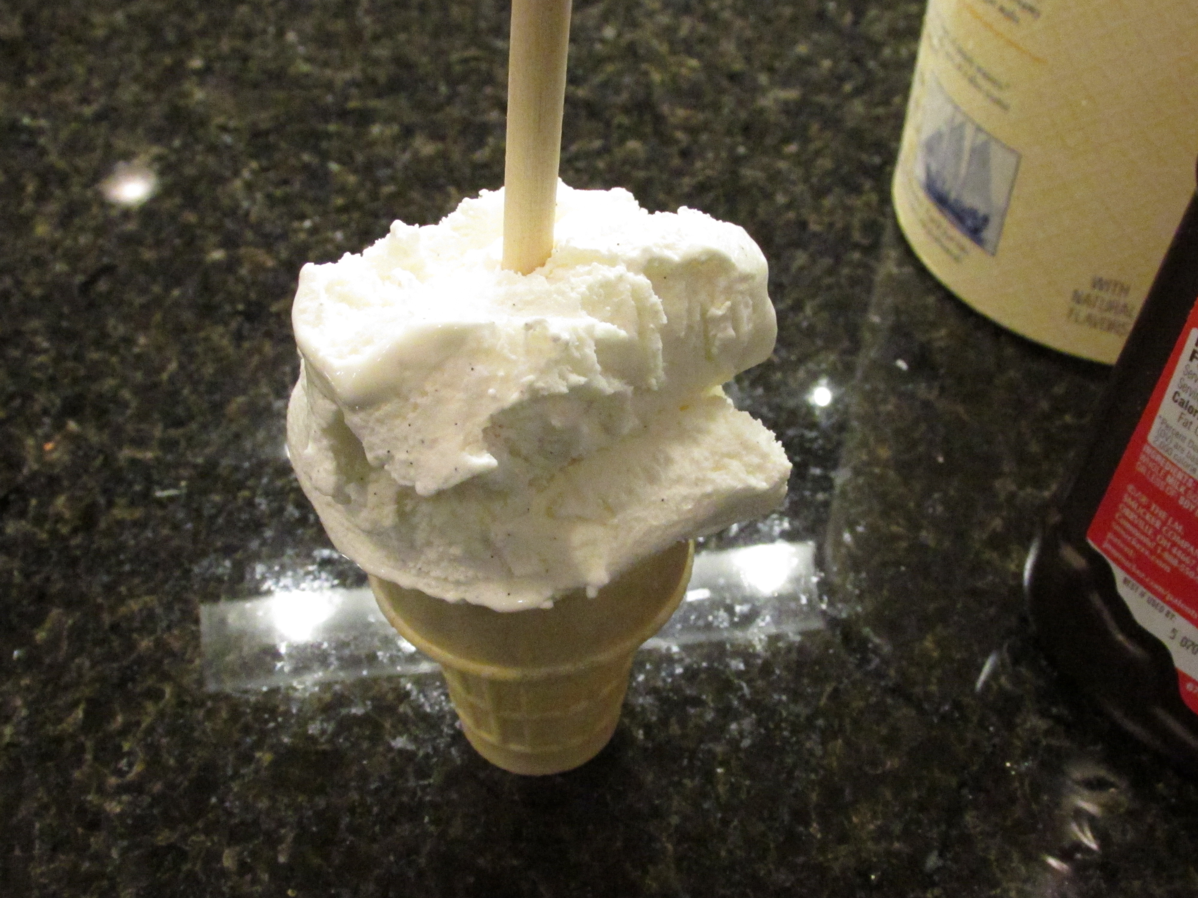 Before you begin – shake the topping very well (around one minute).  Fill ice cream cone(s) to desired height and place in freezer for around 15 minutes.  Remove from freezer and, using a dowel or chopstick, poke a hole down the center of the ice cream.