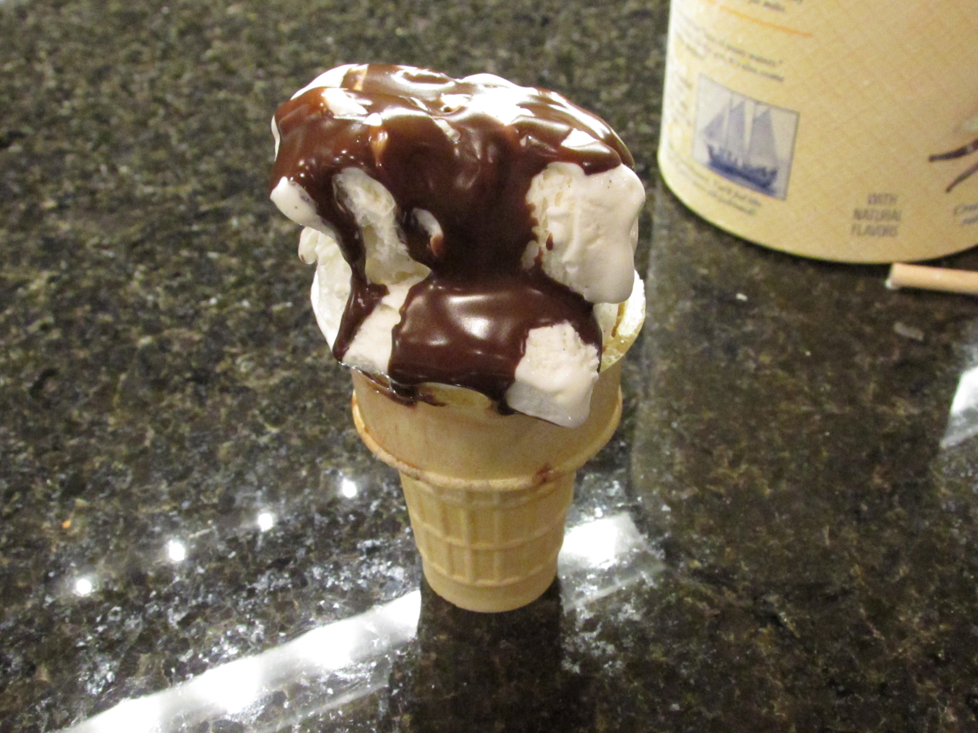 Shake topping some more and carefully drizzle down the hole, filling hole to the top.  Working over a sink or plate to catch any drips, drizzle topping lightly and in layers over the top of the ice cream.  If using nuts, top chocolate with nuts.  Let cone rest for a couple of minutes for chocolate to harden.