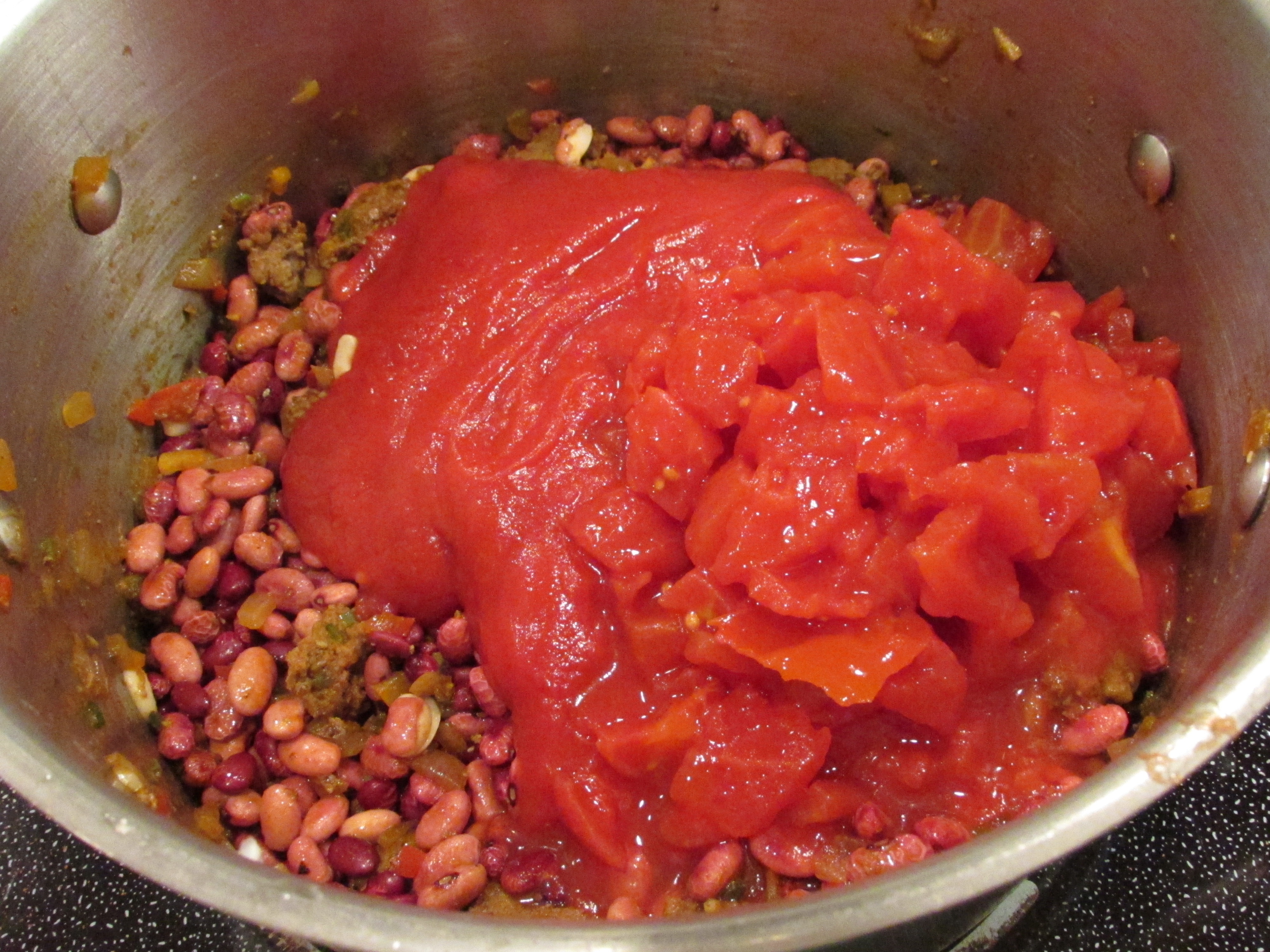 In a large pot over medium heat, combine all ingredients except tomato sauce, diced tomatoes and beans. Cook, stirring occasionally, until beef is brown and vegetables are soft. Stir in tomato sauce and diced tomatoes.