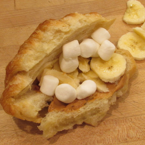Preheat waffle iron. Slice croissant lengthwise, keeping one edge in tact. Spread peanut butter evenly on each side of inside of croissant. Fill with banana and marshmallow. Place in waffle iron, smash and cook for around 2 minutes or until golden. Serve hot, topped with rocky road ice cream.