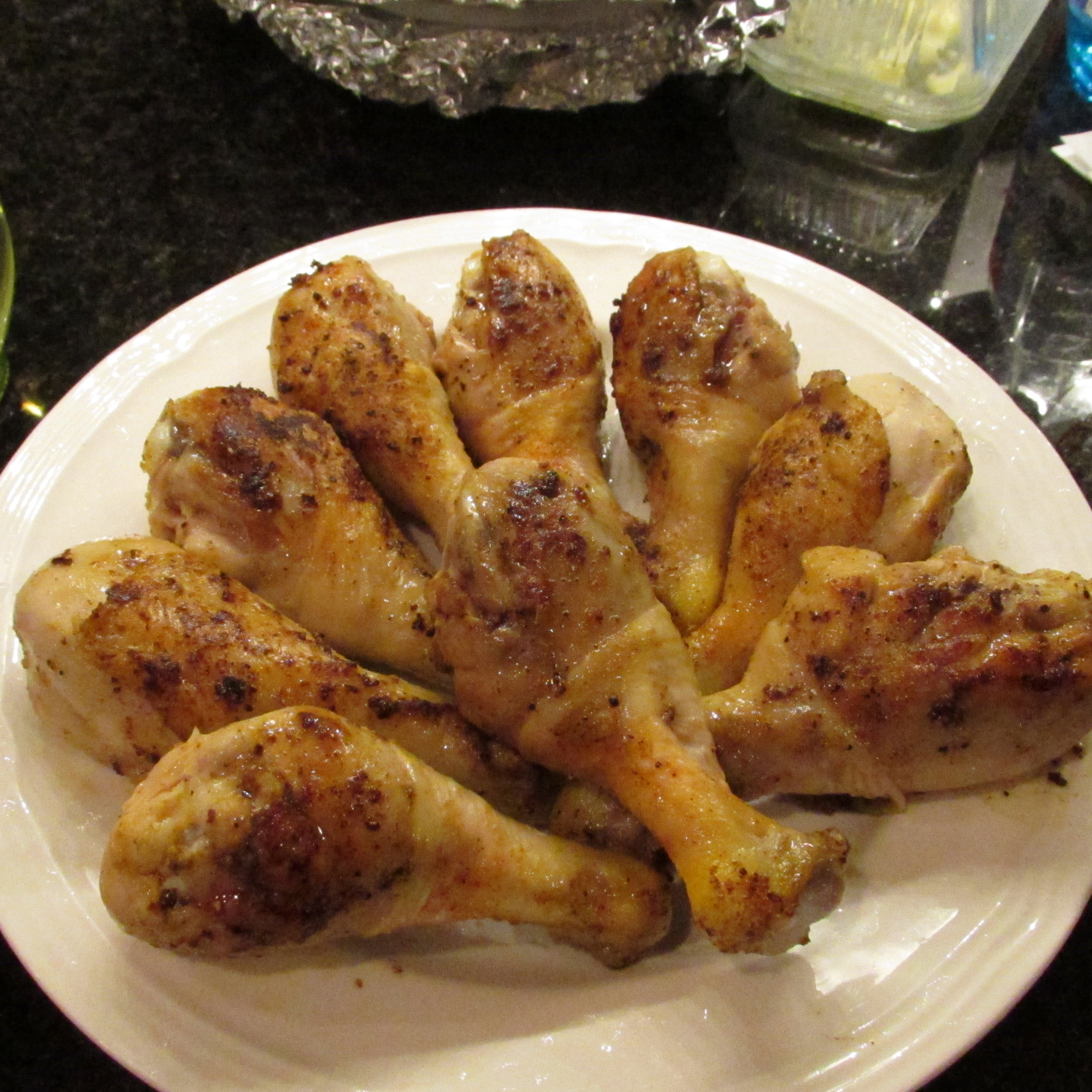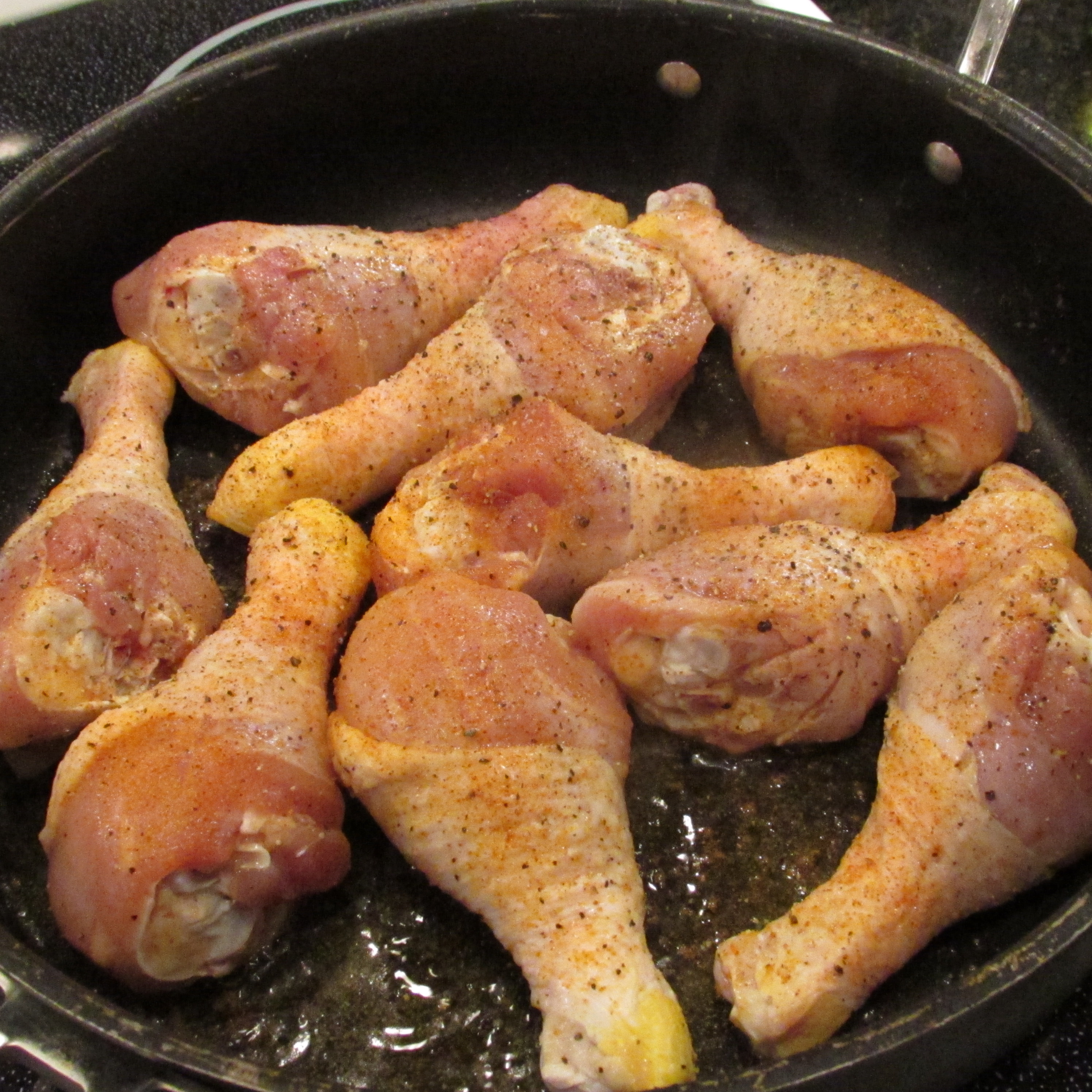 Sprinkle chicken with seasoning salt and black pepper. Preheat a large skillet to medium heat (around 375 degrees). Heat oil in pan. Cook chicken for 7 minutes or until golden. Flip and cook another 5 minutes or until golden. Remove drumsticks to a plate and let rest, reserving oil and drippings in pan.