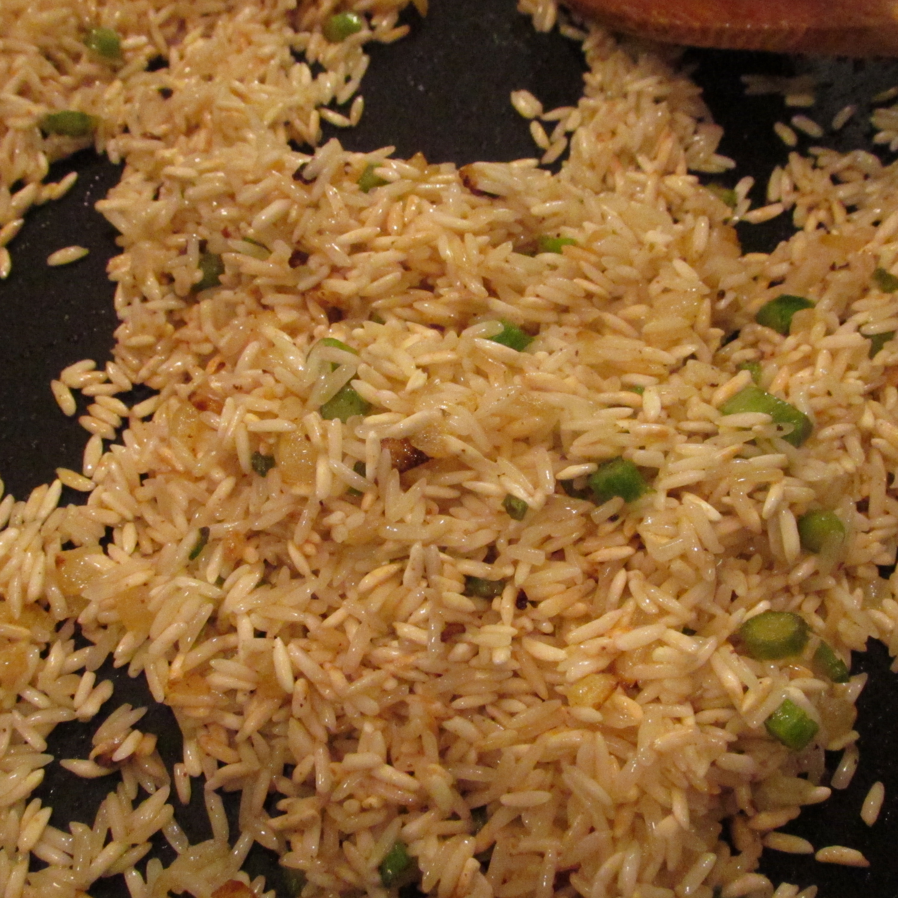 Stir in onion, garlic and asparagus ends into the oil/drippings. Cook, stirring occasionally, until onions are translucent and edges begin to brown. Stir in rice and continue cooking, stirring occasionally, until rice begins to brown. Stir in water, salt, black pepper, onion powder and parsley.