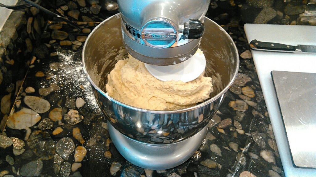 Mix in stand mixer with a dough hook for 7 to 8 minutes. Turn onto lightly floured surface and knead by hand 3 to 4 minutes. The dough should not be too dry or too sticky. If you dough is mixed and kneaded correctly it should pass a “window pane” test – take a small ball and gently stretch it out. It should stretch without breaking.