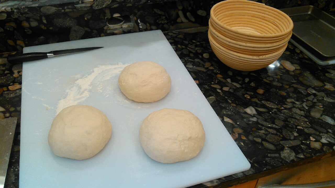 After 4 hours divide the dough into 3 or 4 equal pieces and shape into baguettes, boules or batards. Place dough on lightly floured surface and knead for about 30 seconds, tucking it overhand into itself. At this point your dough should feel like a baby’s butt and spring back when pushed on.