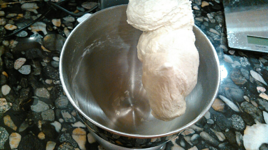 Stir together 9 ounces unbleached bread flour and 16 ounces barm in your stand mixer bowl until it forms a firm ball add no more than a tablespoon of water at a time. Mix on low speed 4- 5 minutes or until a firm ball forms.  There should be nothing left on the inside of the bowl. It is okay if it’s a little sticky but it should not be stiff or dry.