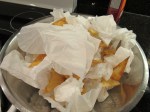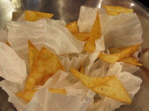 Place hot chips in paper towel-lined bowl and sprinkle with a tiny bit of salt. Repeat with more crumpled up towels and chips. When the chips are drained, they can be removed to a separate bowl. If you want to reheat them for that extra special touch, place them on a cookie sheet and bake in a 400 degree oven for a few minutes. EVERYONE loves hot chips.