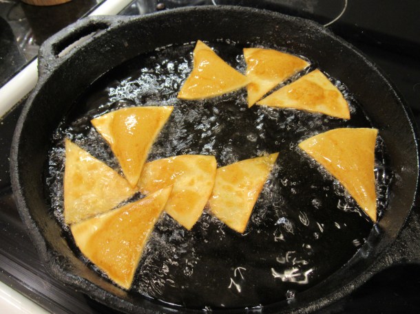 Fry tortillas in batches large enough to mostly fill the pan without crowding (around 12 chips in my cast iron skillet). Once the very edges start to brown (around 1 minute), flip the chips and cook around 1 more minute or until golden.