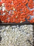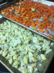 4. Drizzle both pans with 2-3 tablespoons olive oil, just enough to lightly coat the vegetables. Sprinkle sparingly with salt and pepper. Toss. Bake at 425 for 25-30 minutes until veggies are tender and have a bit of nice brown caramelization. The carrots and garlic with take a few minutes longer than the cauliflower.