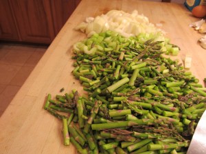 In a large stockpot, heat olive oil over medium heat, stir in asparagus, celery and onion.  Sprinkle with a little salt and pepper.  Continue cooking until onions turn translucent.