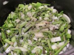 In a large stockpot, heat olive oil over medium heat, stir in asparagus, celery and onion.  Sprinkle with a little salt and pepper.  Continue cooking until onions turn translucent.