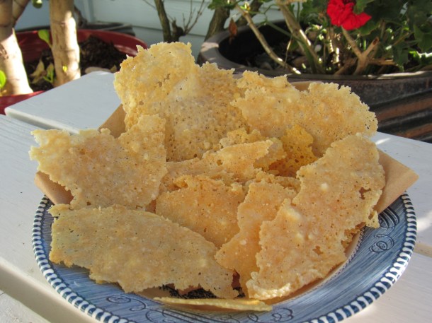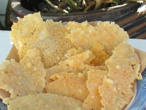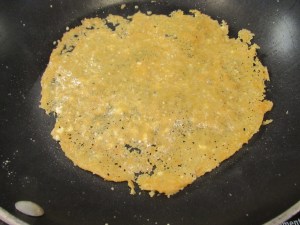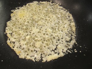 Return pan to burner and cook for another minute or so or until cheese begins to make bubbles. Remove pan from heat, allow Parmesan round to cool slightly then place on a paper towel – lined pan. Repeat as desired. As the round cools completely, it will become crisp. Break into desired pieces and….