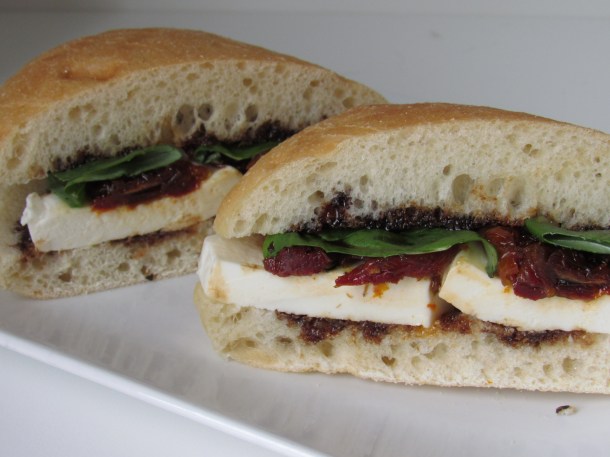 Drizzle balsamic glaze on bread, top with buffalo mozzarella, sundried tomato and basil leaves.