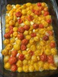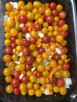 2. Place tomatoes, peppers, onion, garlic, oil, and a light sprinkle of salt and pepper into an oven safe dish. Toss.