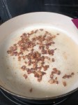 In a large pan over medium-high heat, cook diced bacon. Remove bacon from pan and set aside, but keep the grease in the pan.