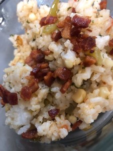 Add in rice a little bit at a time, then finish with cooked bacon.