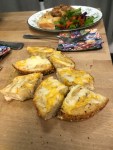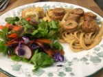 Dinner last night: salad, chicken and smoked mozzarella sausage over linguine, and I turned a sad “everything” bagel into cheesy garlic bread.