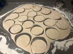 Using a circle cutter, cut dough rounds. Stretch them slightly, then place onto a baking sheet lined with parchment. Allow to rise 20 minutes.