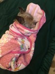 Bob the beagle who got a feather stuck to his nose and walked around with a mustache for a good couple hours. And Tiny Dog the mutt of unknown origins swaddled like a baby.