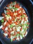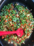 In a large sauté pan over medium high heat, add a tablespoon of oil and cook carrots for about 5 minutes, then add onion and celery. When the onion has softened, add frozen peas and cook until no longer frozen (about 3 minutes). Put vegetable mixture into a bowl and set aside. Return pan to the stove.